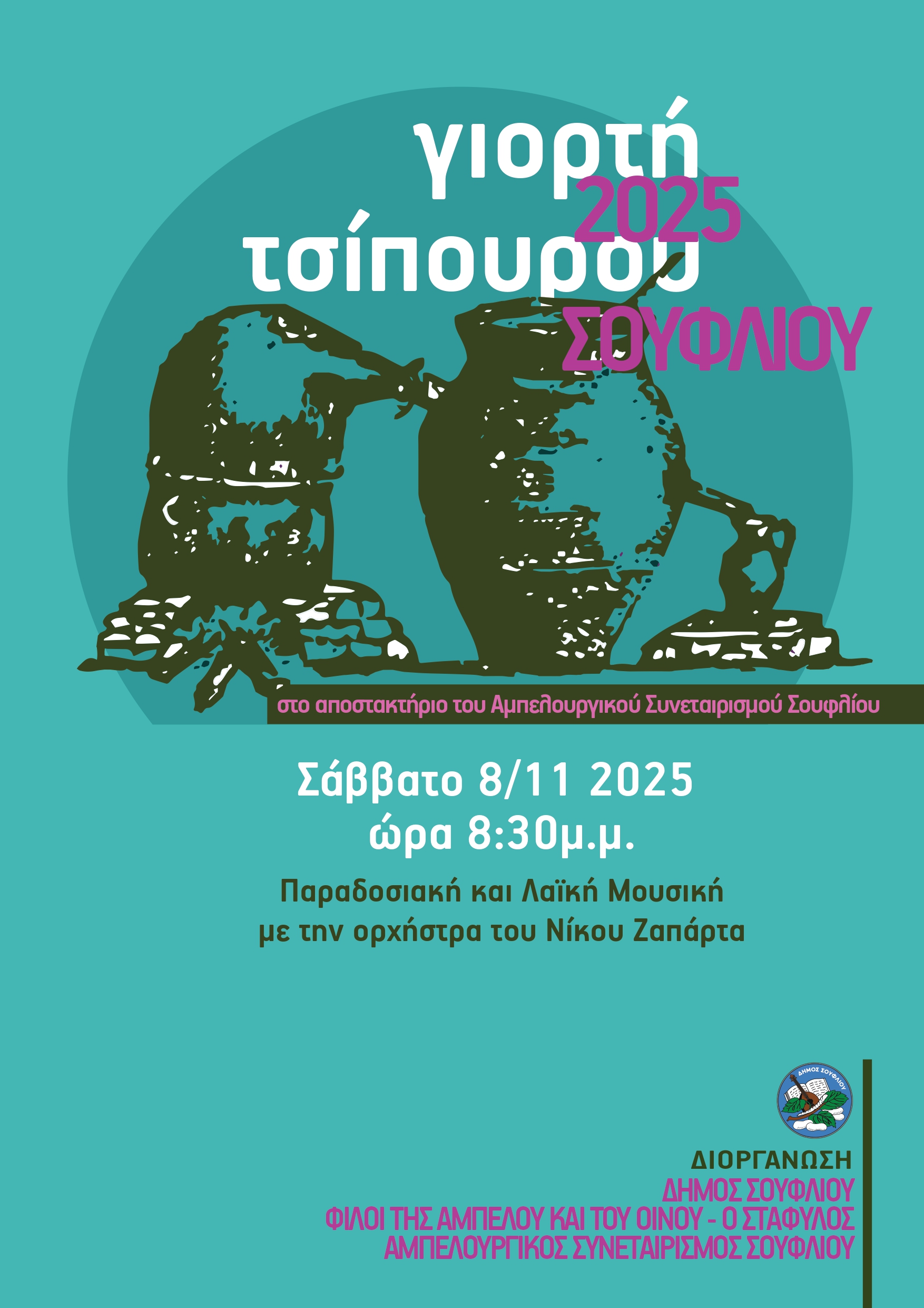Ο Δήμος Σουφλίου σας προσκαλεί στη Γιορτή Τσίπουρου, που πραγματοποιεί σε συνδιοργάνωση με τον Σύλλογο Φίλων της Αμπέλου και του Οίνου “Ο Στάφυλος” και τον Αμπελουργικό Συνεταιρισμό Σουφλίου,