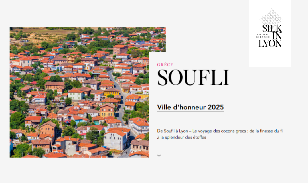 Η Silk in Lyon, που από το 2018 συγκεντρώνει χιλιάδες επισκέπτες από όλο τον κόσμο, αναδεικνύει κάθε φορά τον πλούτο και τη σύγχρονη δυναμική της τέχνης της μεταξουργίας μιας ξεχωριστής πόλης του κόσμου που συνδέεται με το μετάξι. Μετά την Hangzhou της Κίνας το 2018, το Kyoto της Ιαπωνίας το 2019, το Como της Ιταλίας το 2022 και τη Λυών της Γαλλίας το 2023, φέτος, ανάμεσα στις υπέροχες πόλεις του κόσμου, πρωταγωνιστεί η πόλη του Σουφλίου!