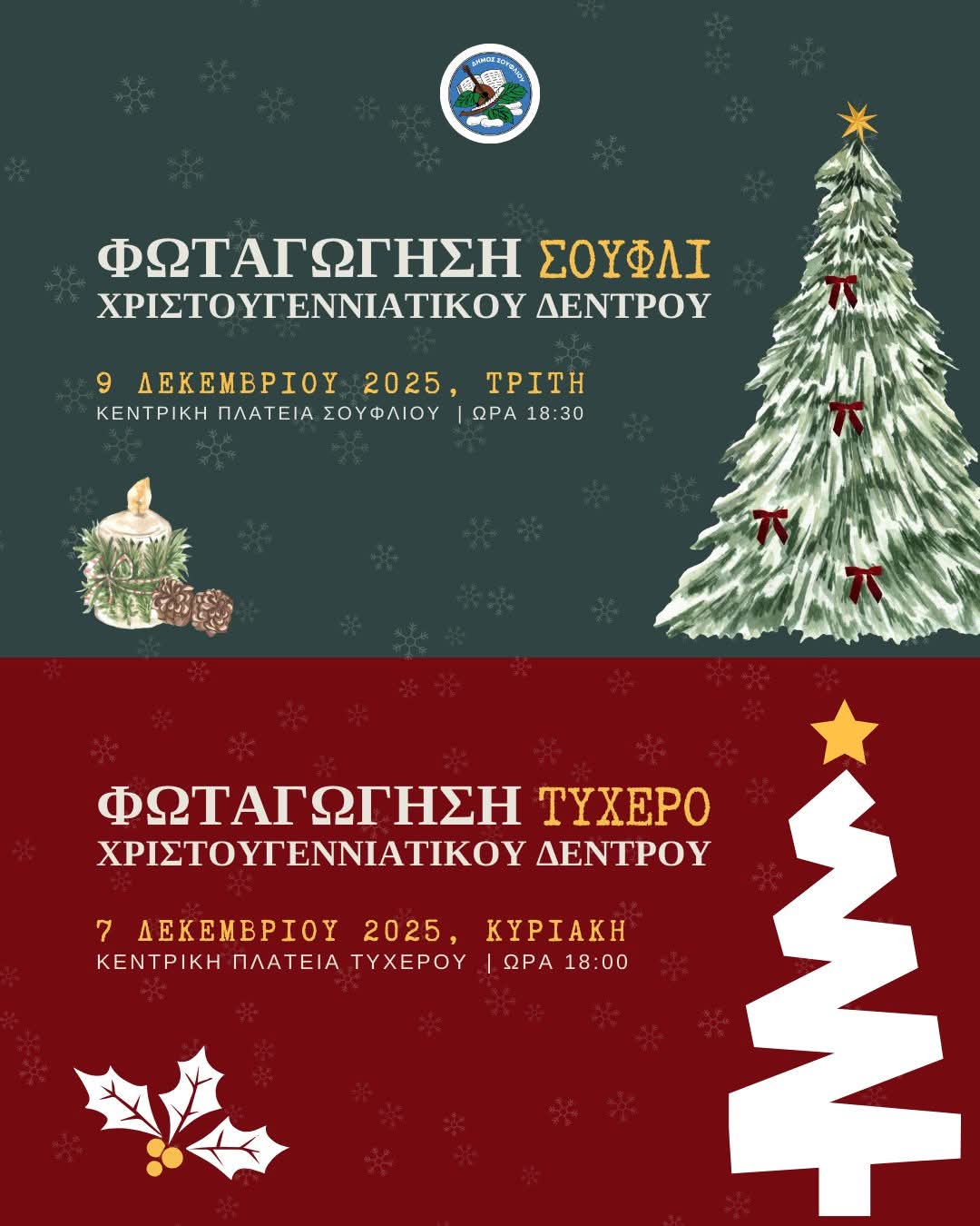 Σας περιμένουμε όλους, για να καλωσορίσουμε το χριστουγεννιάτικο φως στην Κεντρική Πλατεία Σουφλίου την Τρίτη 9 Δεκεμβρίου και στην Κεντρική Πλατεία Τυχερού την Κυριακή 7 Δεκεμβρίου 2025, εγκαινιάζοντας την φετινή εορταστική περίοδο, παρέα με τοπικούς φορείς, κάλαντα, μουσικές και διάφορες άλλες δράσεις!